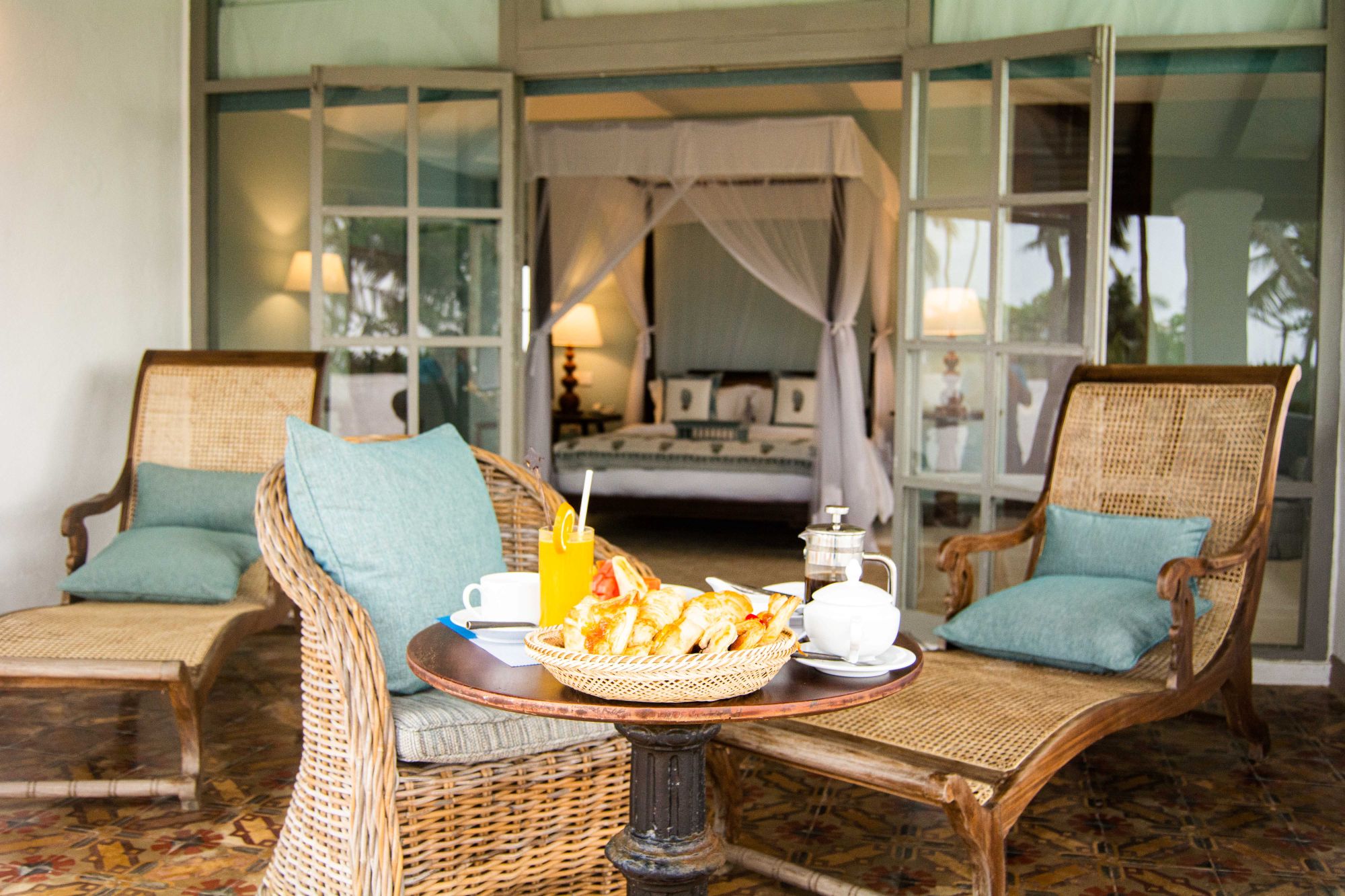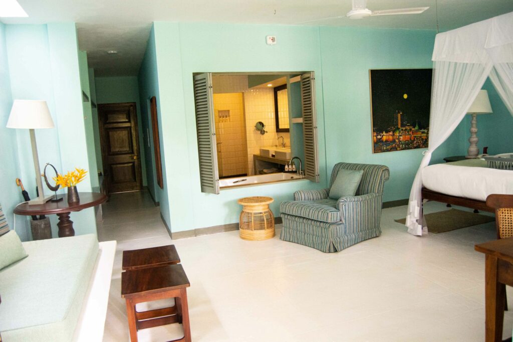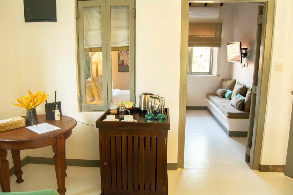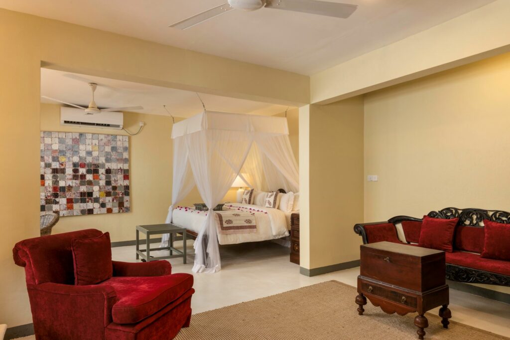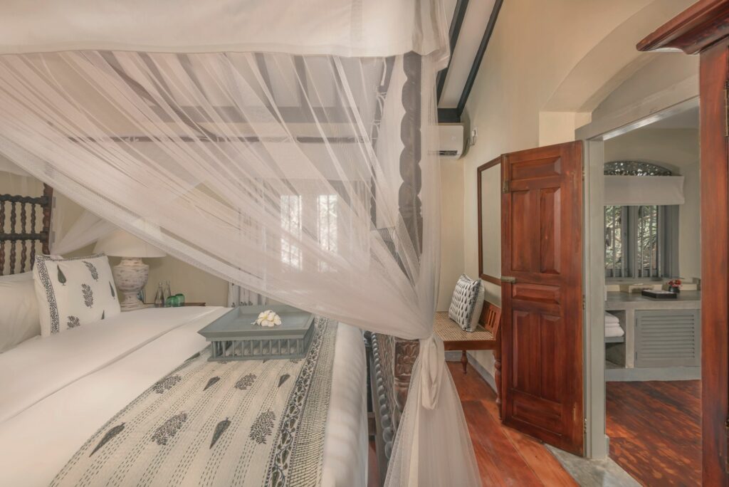 The most characterful suite at The Villa Bentota, the Mohotti Suite is reached via a graceful wooden staircase and features an elegant sitting room and two spacious bedrooms sharing a single bathroom with shower. Both bedrooms are styled with four-poster beds and thoughtful colonial touches that echo the villa’s historic charm.