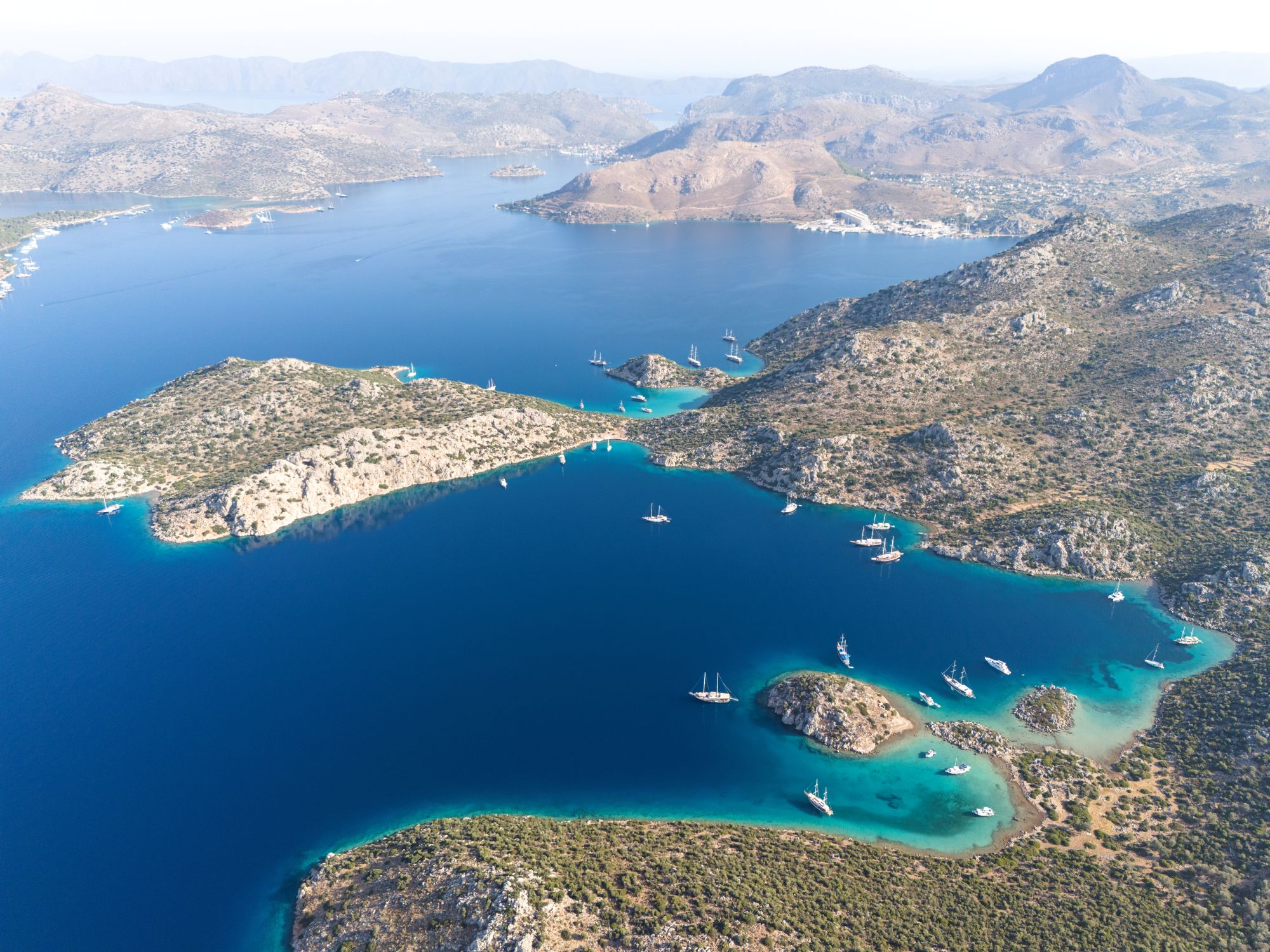 Aerial footage of the Bozburun peninula quiet coves and corners near Sogut and Taslica