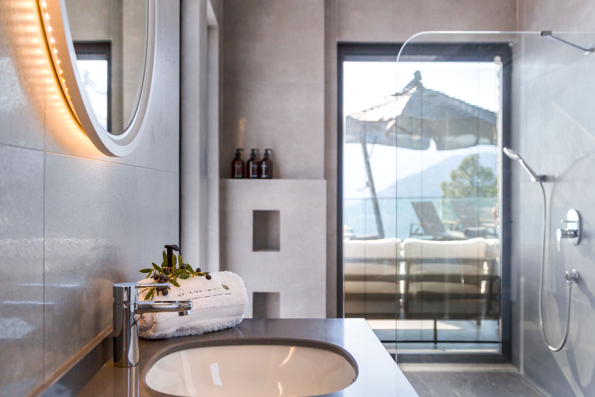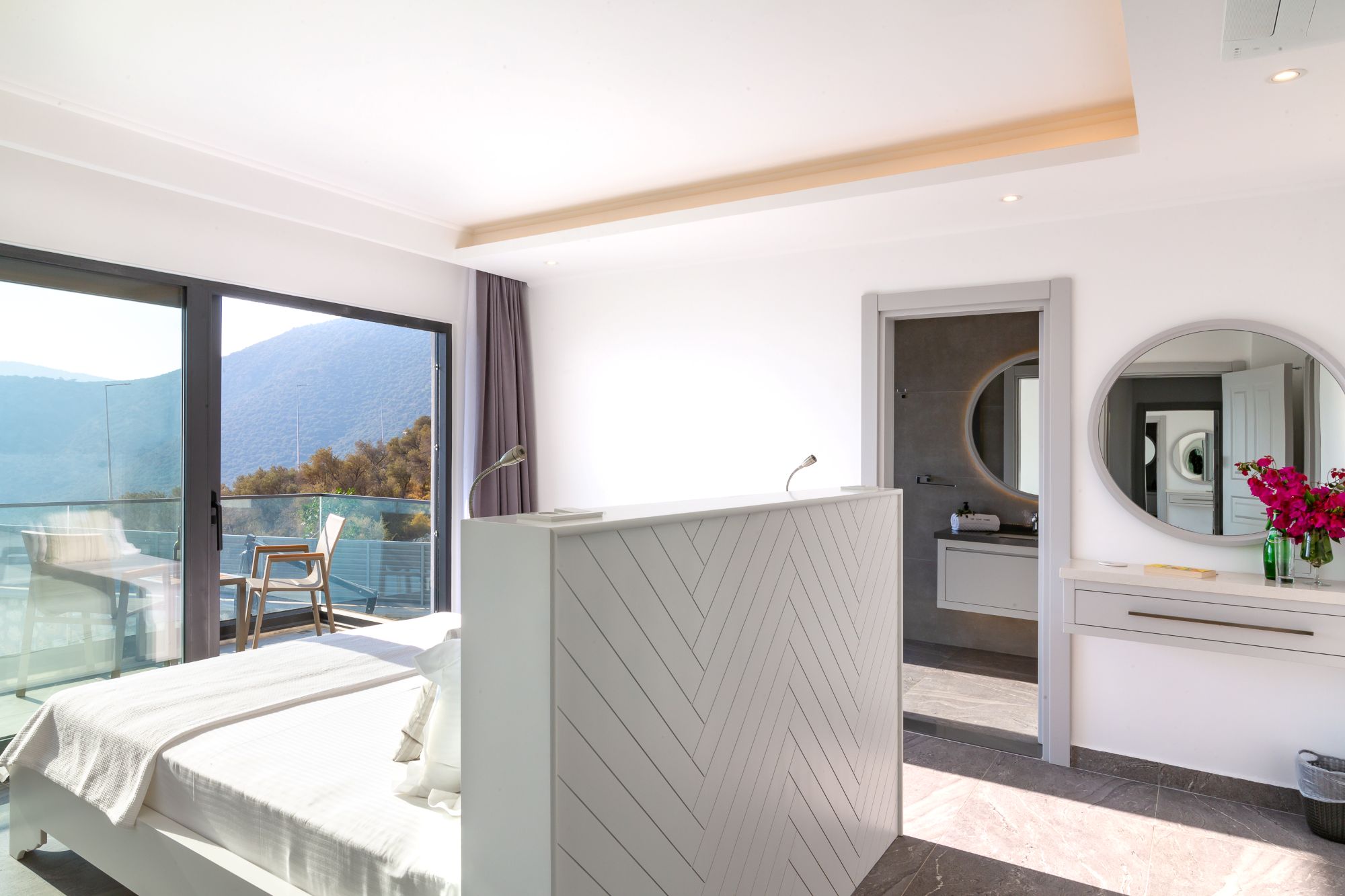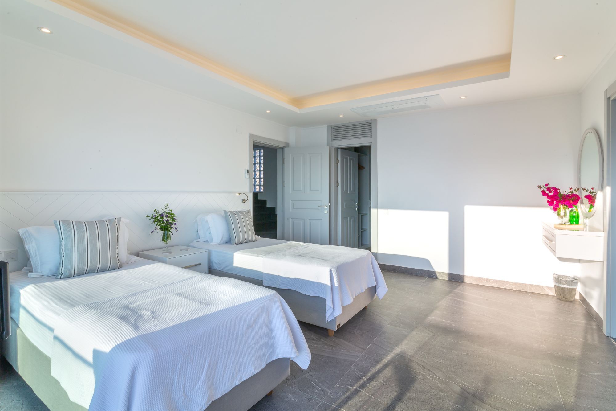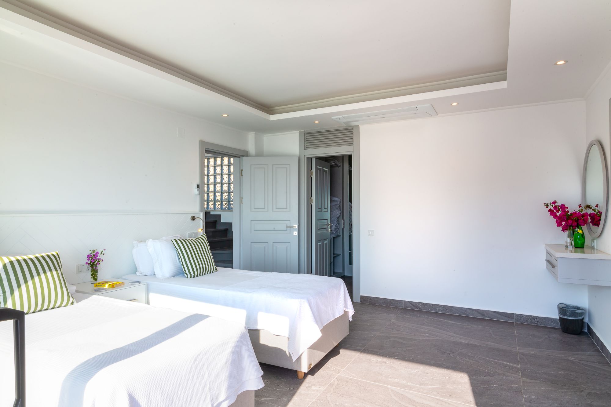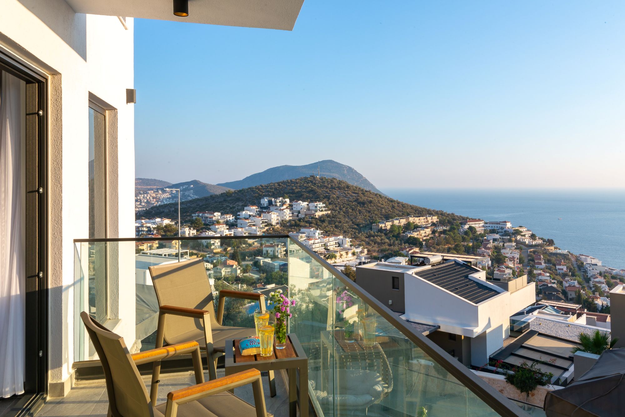 Upstairs, three further en-suite bedrooms open onto a wraparound balcony, each enjoying uninterrupted sea views across Kalamar Bay. These rooms are well proportioned and simply styled, designed to make the most of their elevated setting.