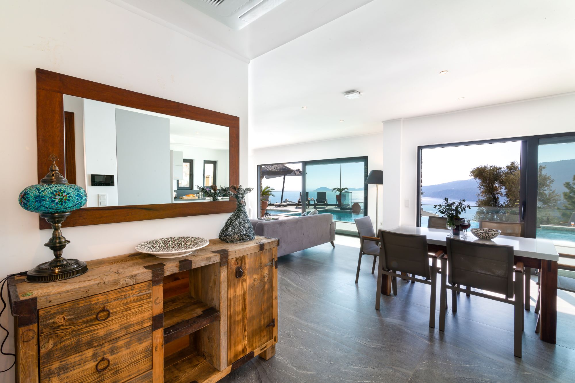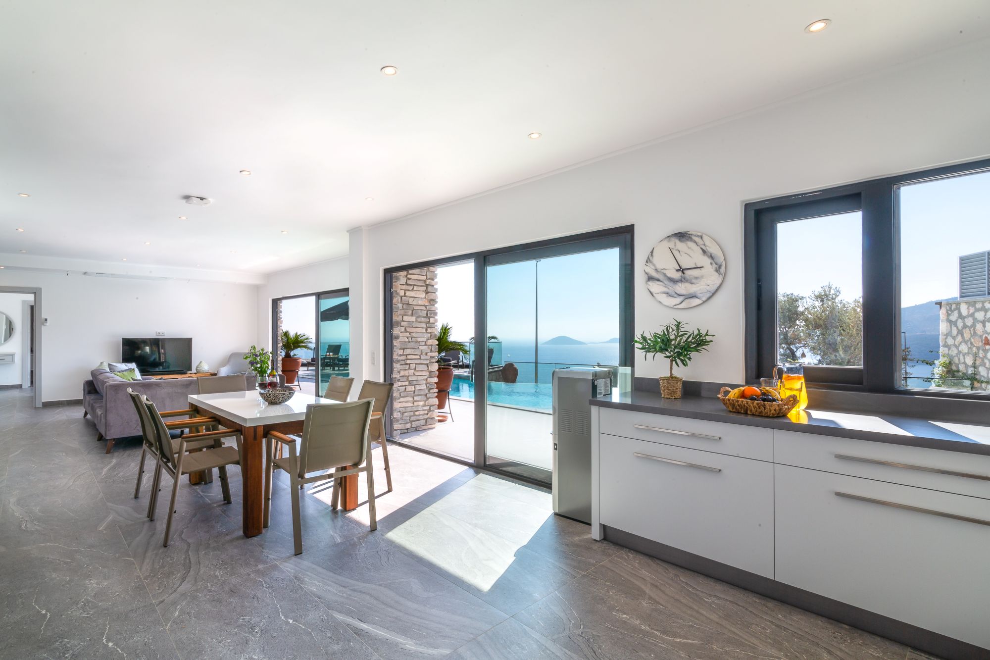 Entering the villa, you step into a large, light-filled open-plan living and kitchen area, designed to frame the sea views beyond. The fully equipped kitchen and spacious sitting area open directly onto the pool terrace, creating an easy flow between indoor and outdoor living.