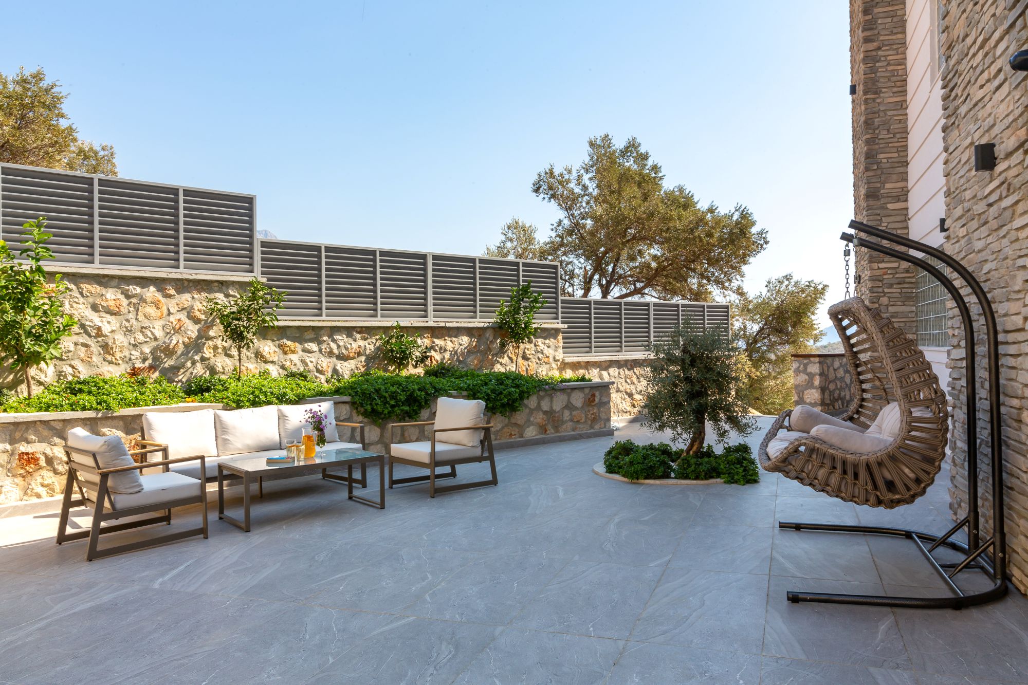 Outdoor living is a key strength of The Olive House. From the private courtyard at the entrance level to the expansive pool terrace and rooftop spaces, the villa offers multiple areas for dining, lounging and socialising throughout the day. The combination of sea views, thoughtful landscaping and well-proportioned terraces creates a relaxed yet refined environment, ideal for making the most of Kalkan’s Mediterranean climate.