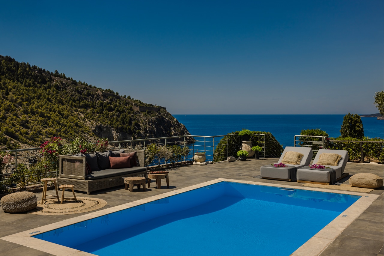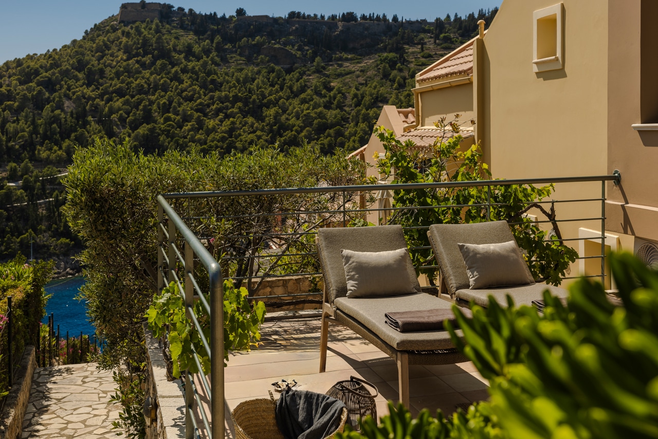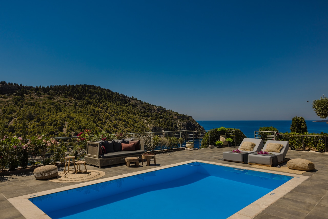A romantic two-bedroom villa for four with sweeping sea views over Assos Bay