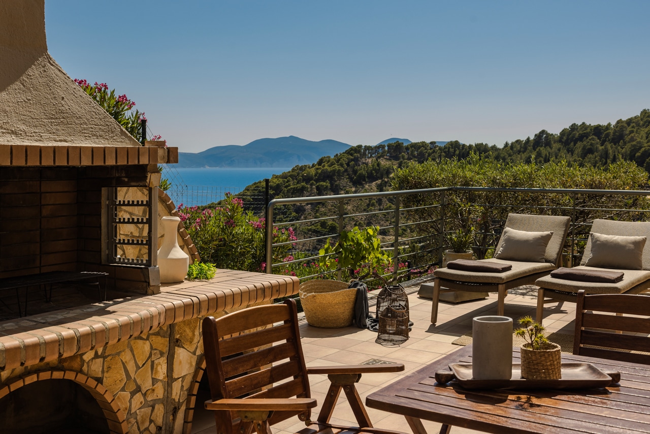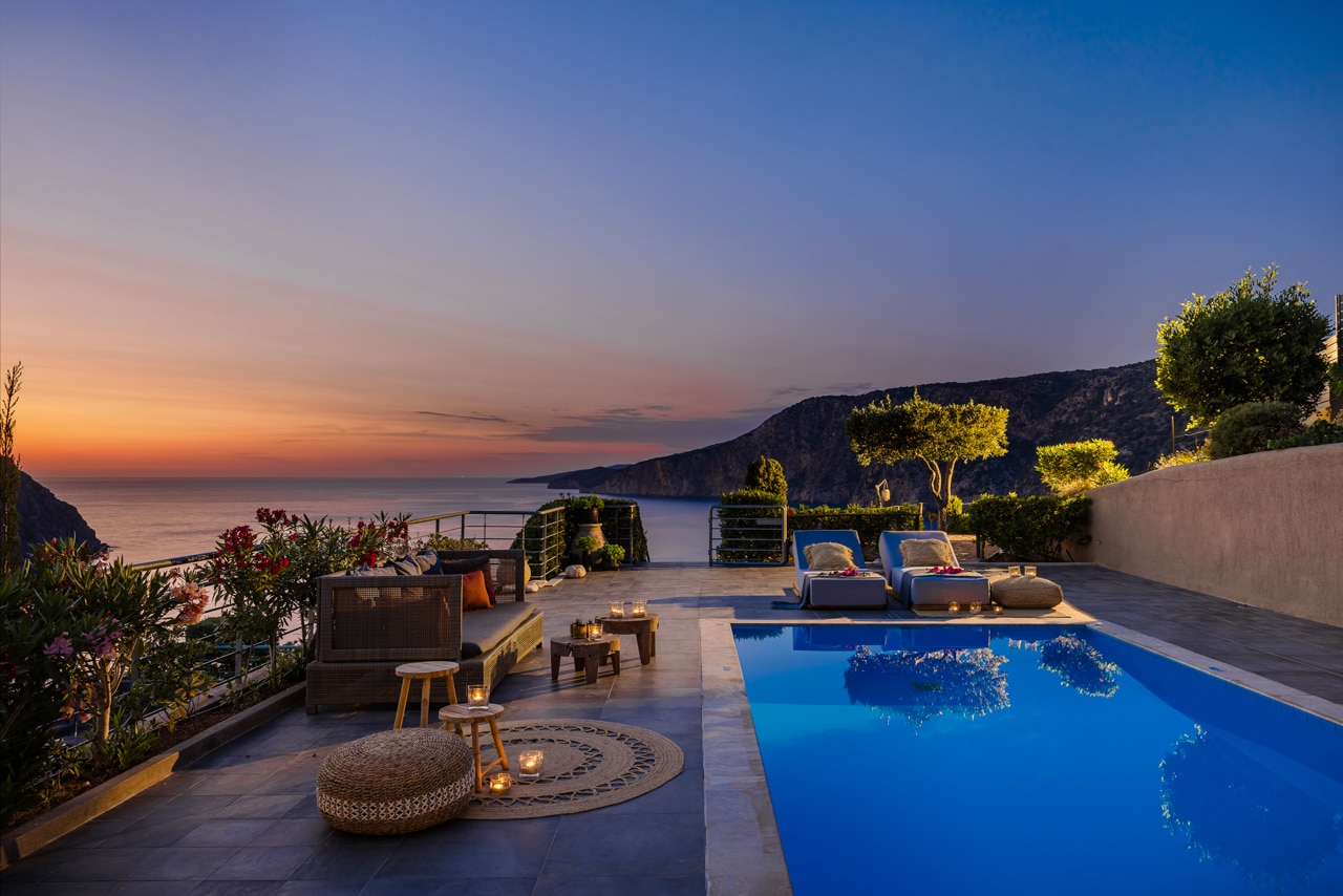 Villa Agapi has sun loungers and a comfy shaded seating and dining area and barbecue and beautiful views. There is a private staircase, winding down to the seafront, leading to a rock platform from where guests can take a dive into the azure waters of the Ionian Sea.