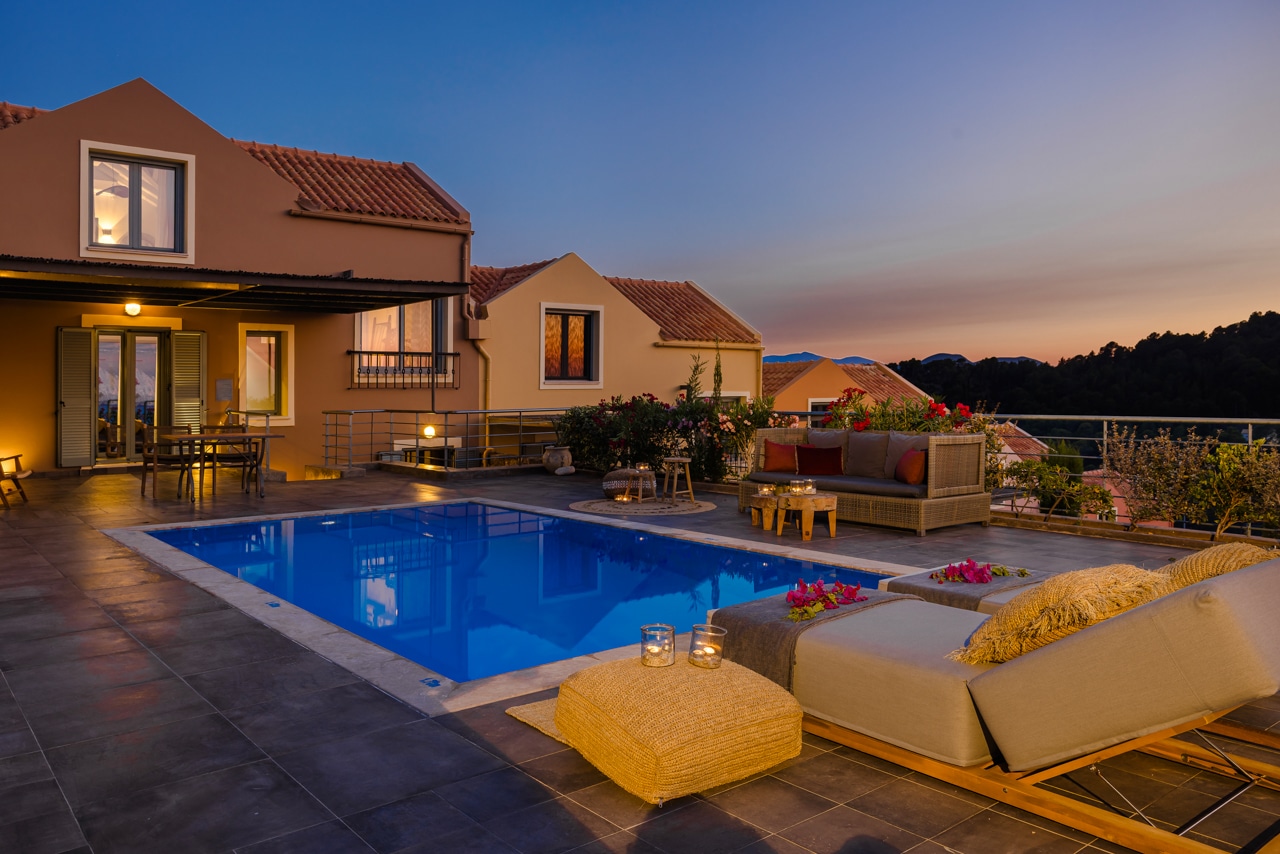 Outdoors, the villa offers generous space for al fresco living, from sun-loungers and dining areas to peaceful corners for reading or gazing out to sea. With its elevated position, stylish interiors, and private pool, Villa Agapi Braunis Horio Kefalonia is as romantic as it is refined.