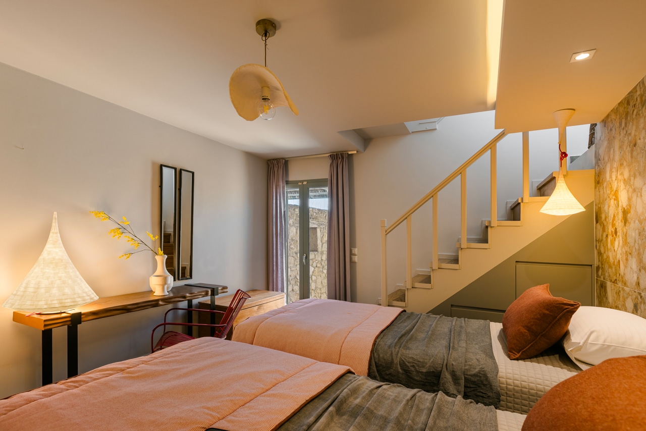 Twin bedded room with balcony and sea views and steps leading down to the pool terrace.